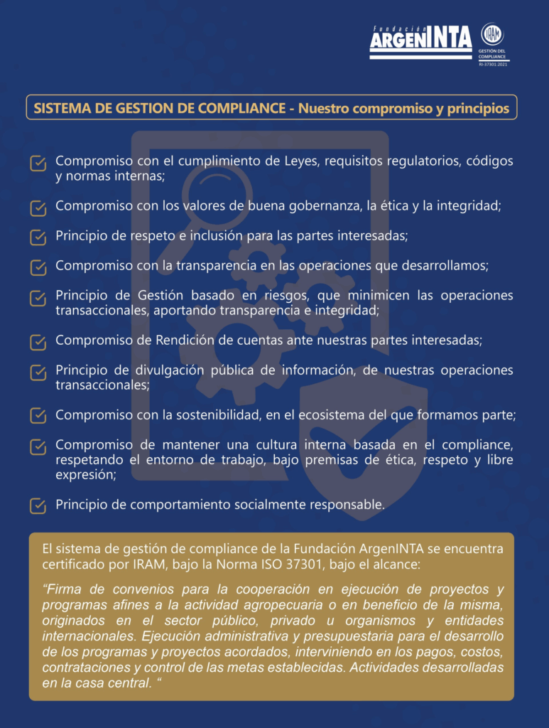 Compartir: La certificación ISO 37301 reafirma nuestro compromiso con procesos sólidos, decisiones responsables y una cultura organizacional que prioriza la ética en cada proyecto que impulsamos. Seguimos fortaleciendo nuestras capacidades para garantizar operaciones confiables y un desempeño alineado a los más altos estándares internacionales. #Compliance #ISO37301 #GestiónInstitucional #Integridad #Transparencia #Gobernanza #FundaciónArgenINTA #BuenasPrácticas #Ética #SectorAgropecuario OTRAS […]